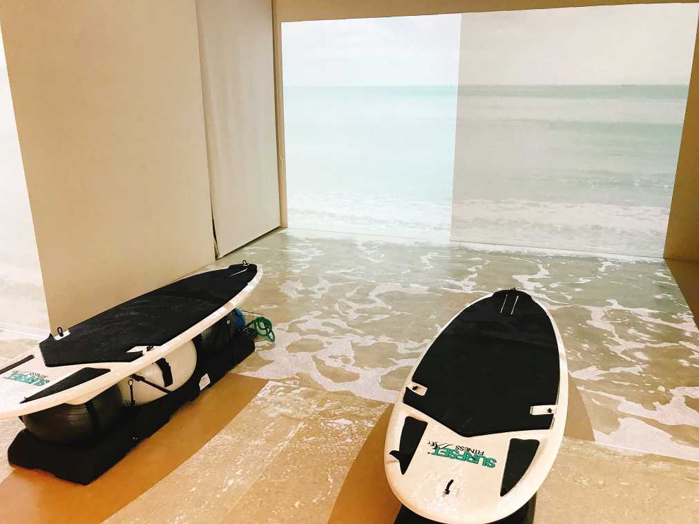 室温は32度と温かく保たれていて、まるでビーチサイドにいるみたい。サーフボードの上で「パドル」、「ウォーターウォーク」、「テイクオフ」などサーフィンの動作を行いながら、体幹を鍛えていきます。