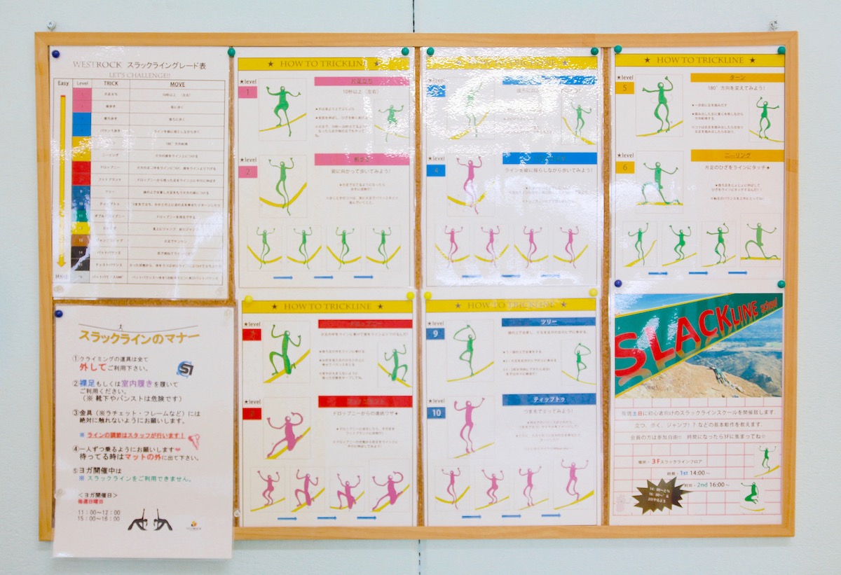 ラインの上を歩けるようになると、「もっといろいろな技に挑戦したい!」と思うように。「ウエスト ロック」にはオリジナルのグレード表があり、イラストで解説されています。簡単そうに見えるのに、いざラインの上に乗ると難しい!