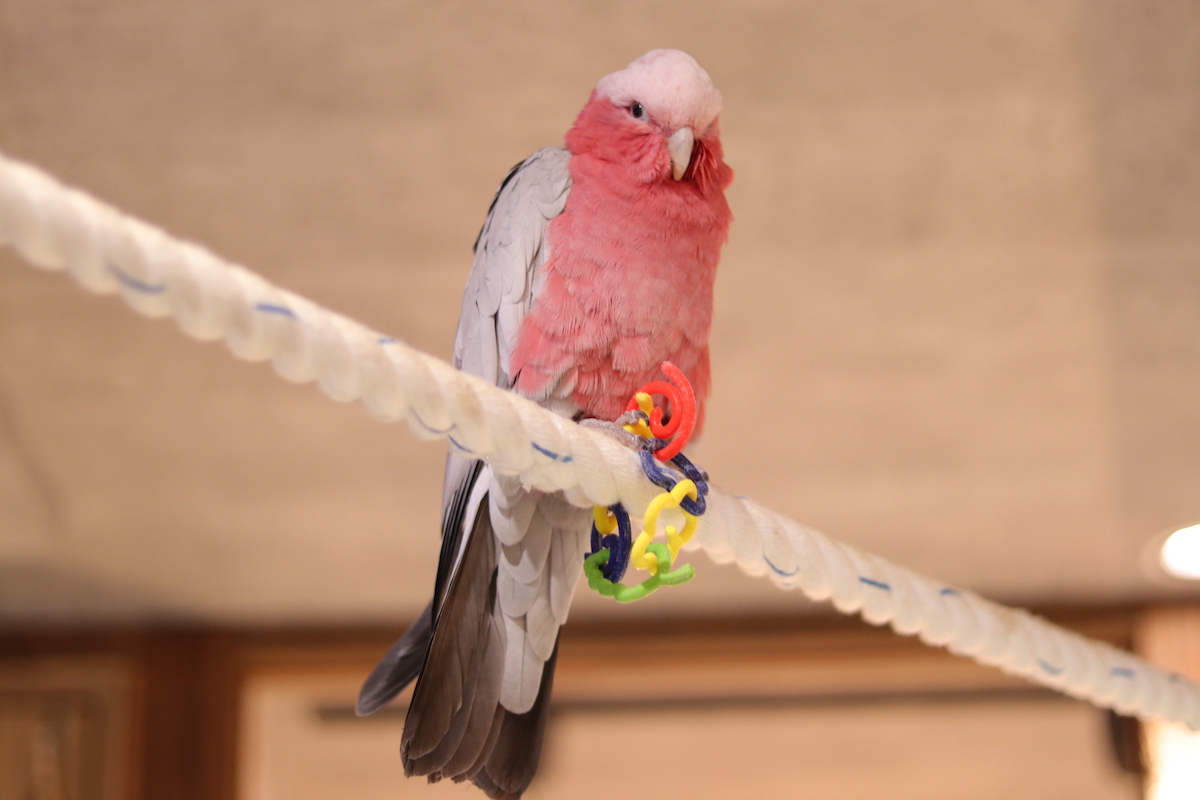 見上げればインコやオウムたちも。スタッフさんの手に乗ってご挨拶をする時間など、いろんな催しがあります。