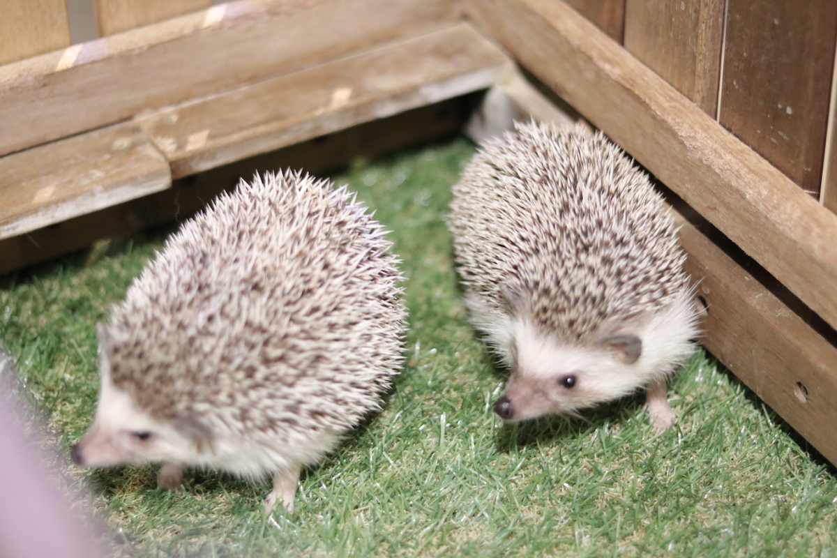 「キャンプタイム」(16時30分~21時)には、夜行性の動物が中心に。コロコロかわいいハリネズミは、小さなケージに4頭ほど。グローブをすれば両手で包んであげることもできます。手の中でもおとなしく、写真撮影もしっかり行えますよ。