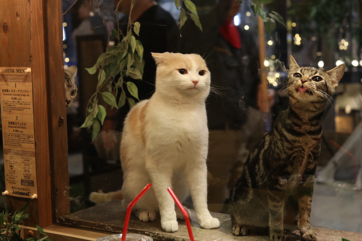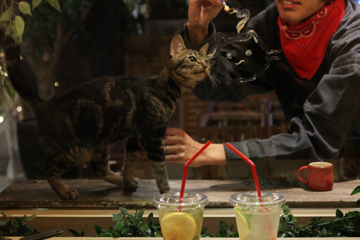 カフェコーナーで食事をしていると、スタッフさんが窓に猫の絵を描き始めます。じつはこの絵の具、猫が大好きなおやつでできているのです。目の前でペロペロ舐める様子を眺めながら、こちら側でもカフェメニューに舌鼓。なんとも贅沢な時間です!