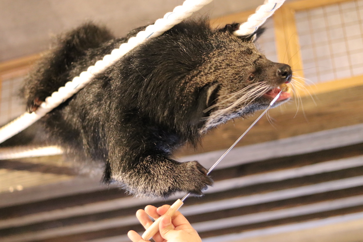 日本で数頭しかいない希少な動物・ビントロング。なんと、直接ふれあえるのは関西でここだけ。別名クマネコとも呼ばれ、かわいい小グマのようにも見えますが、本来はとてもどう猛な動物。ここではきちんと管理されているので危険はなく、遊び好きでとってもチャーミング、手を差し出すとハイタッチしてくれることもあるんですよ。