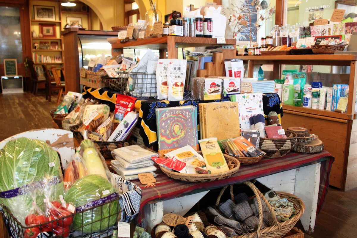 安心・安全でおいしい食材や新鮮な野菜がズラリ。入口近くのグロッサリーでのお買い物も、カフェを訪れる楽しみのひとつ。