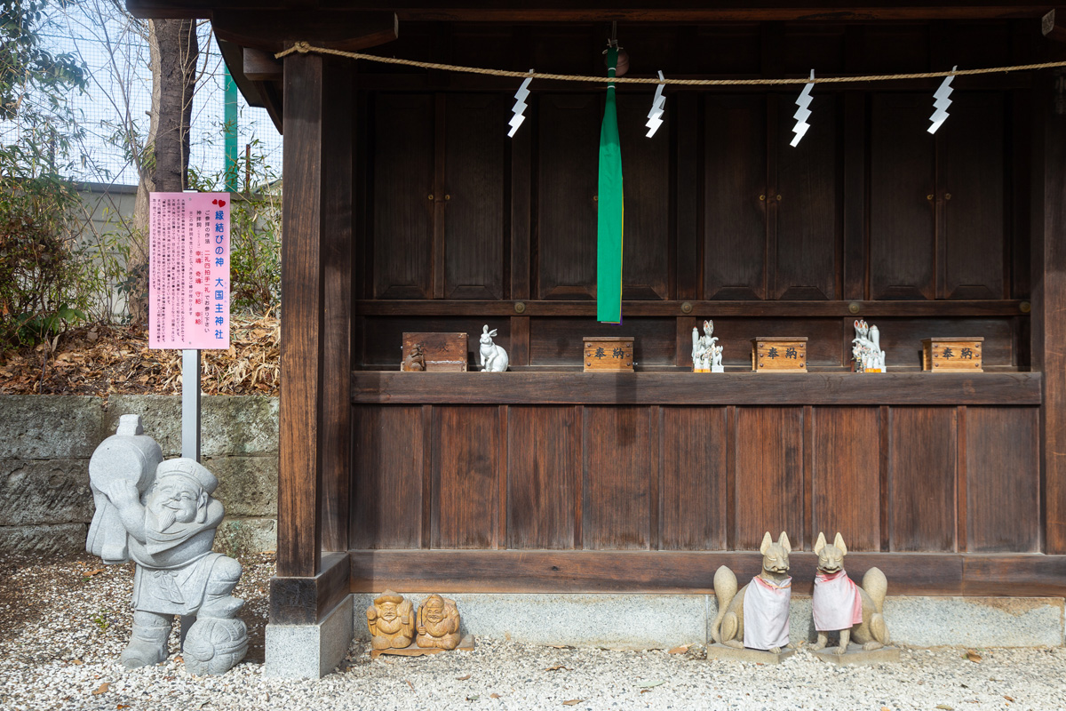 本殿へのお参りが終わったら、続いて向かうのは社殿左手奥にある末社。ここには9つの末社が祀られていて、一番左手に祀られているのが、縁結びの神様として有名な大国主大神(おおくにぬしのおおかみ)。