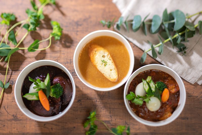 花冷えの夜も暖かく過ごせるメニュー「豚頬肉の赤ワイン煮 春の彩り野菜添え 1600円」や「フレンチオニオンスープ グリュイエールチーズクルトン700円」、「チキンカレーライス1400円」もお花見のお供にぴったり。