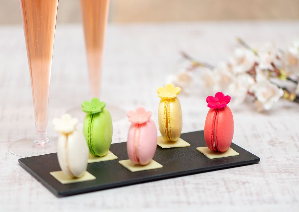 ザ・リッツ・カールトン東京のパティシエが作る「カラフルマカロン1500円」は、シャンドンとのペアリングが上質な時間を彩るスイーツ。シャンドン ロゼ2杯がついた「ブロッサム ペアスイーツセット2900円」もあります。