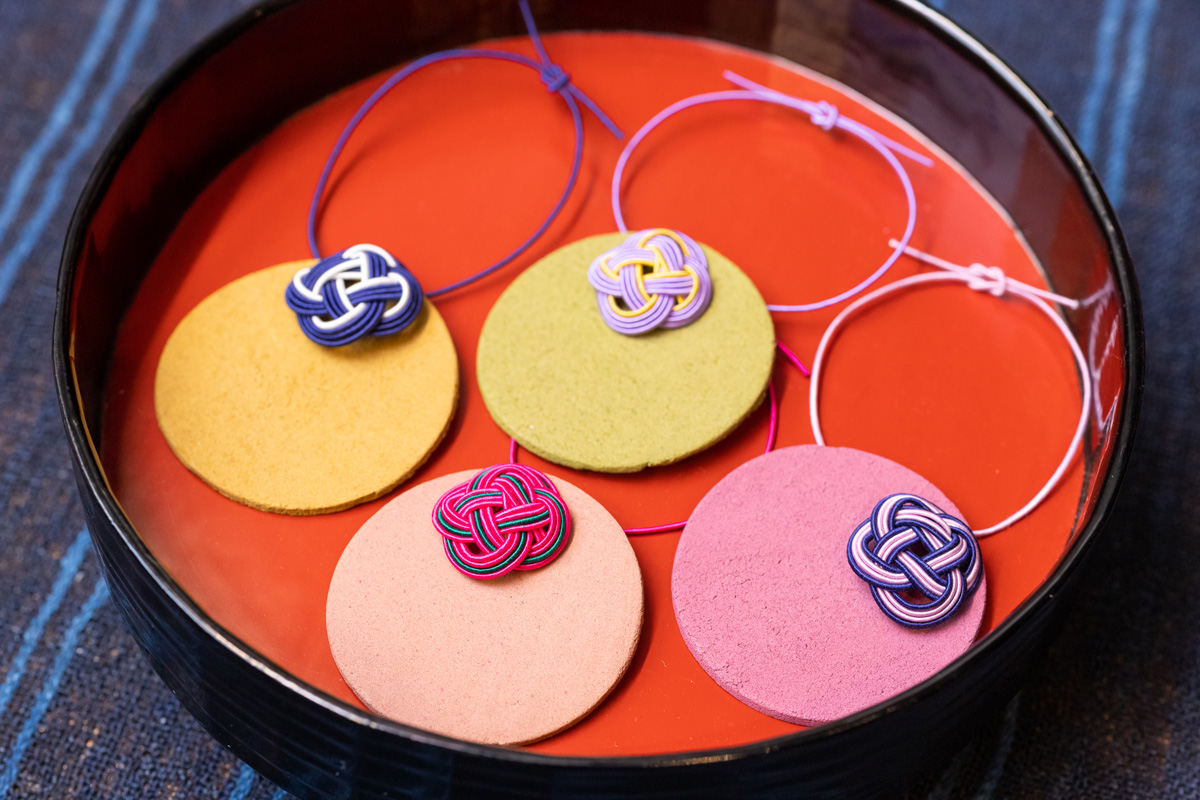カラフルな水引きを取り合わせた「結ひ守(ゆいまもり)」(1080円)も吊して置くだけでいい香りがふわりと漂います。お部屋や車内のアクセントにも最適ですね。