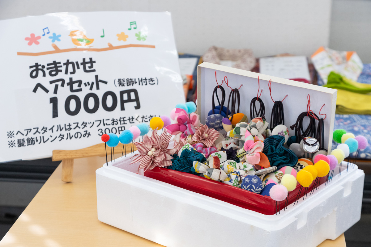 また、着物に合わせて髪を事前にセットしてくるのは、手間がかかるもの。ここならその心配は無用。「おまかせヘアセット」1000円や「髪飾りレンタル」300円も行っています。