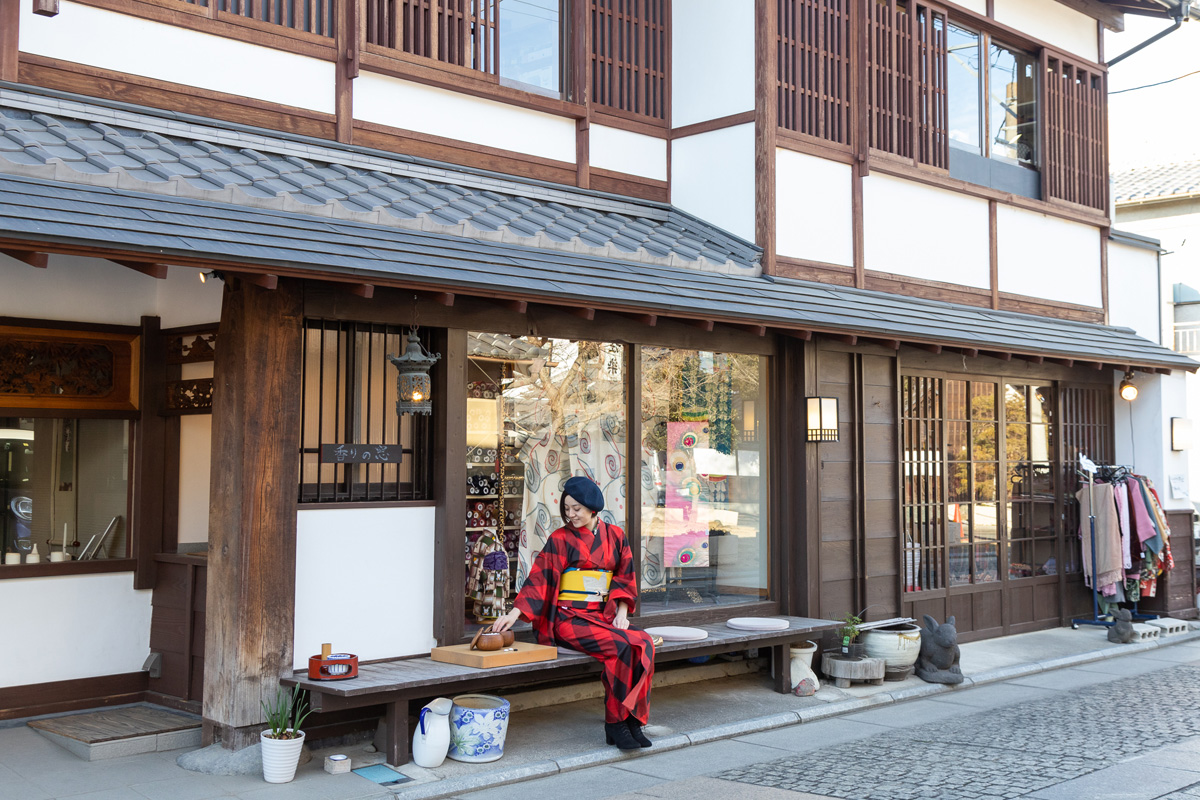 また、「銘仙と古布 うさぎや」は、元々長屋だった昭和初期の家屋を改築したお店。石畳に溶け込む店先に座って、撮影するのもおすすめです。晴れた日には、こちらで抹茶と和菓子を楽しむのもいいでしょう。