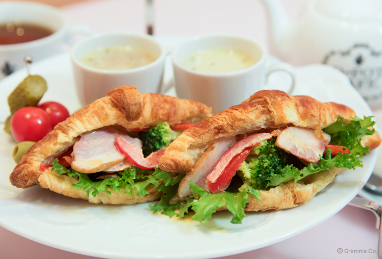 サクサクのクロワッサンに、鴨のスモークとブロッコリーをサンド。飴色に炒めたオニオンの風味とトロトロのチーズが濃厚なオニオンスープが添えられます。