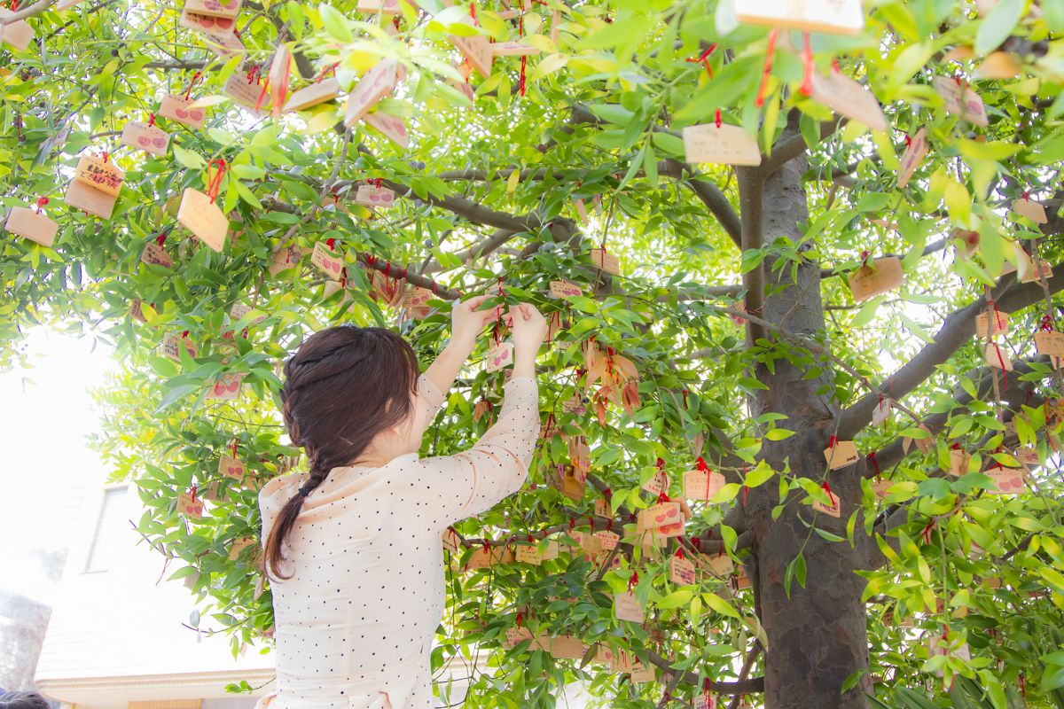 伊豆熱川駅前にある熱川観光協会案内所では2つのハートが描かれた絵馬(200円)を販売。願い事を書き、枝に結びつけて、良縁祈願をしましょう。