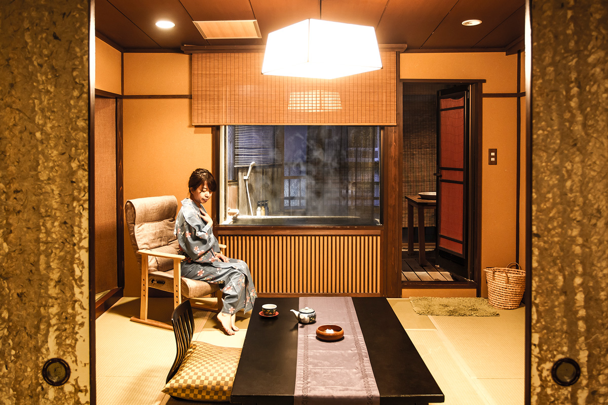 写真はコクーンスイート「とまる」で、和室8畳+6畳に源泉かけ流しの半露天風呂が付いた豪華な造りです。