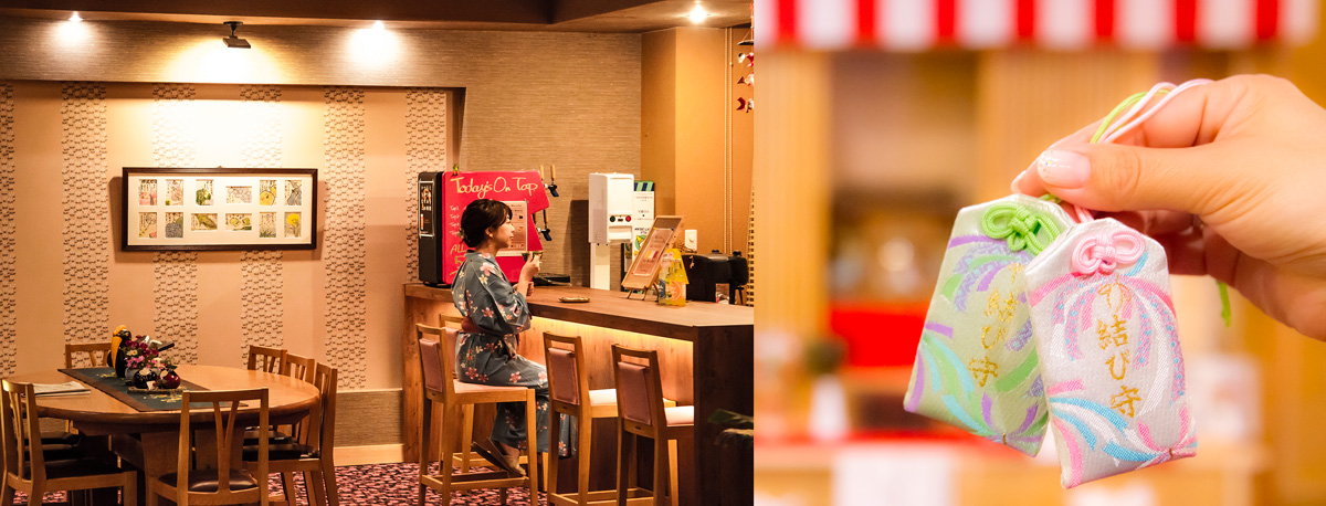 館内にはなんと神社もあるんですよ。この「幸守神社」は熱川湯権現神社の分社にあたり、結び守(写真右、600円)のほか、学業・合格・病気平癒・交通安全のお守りや恋みくじ、御朱印も授与していただけます。