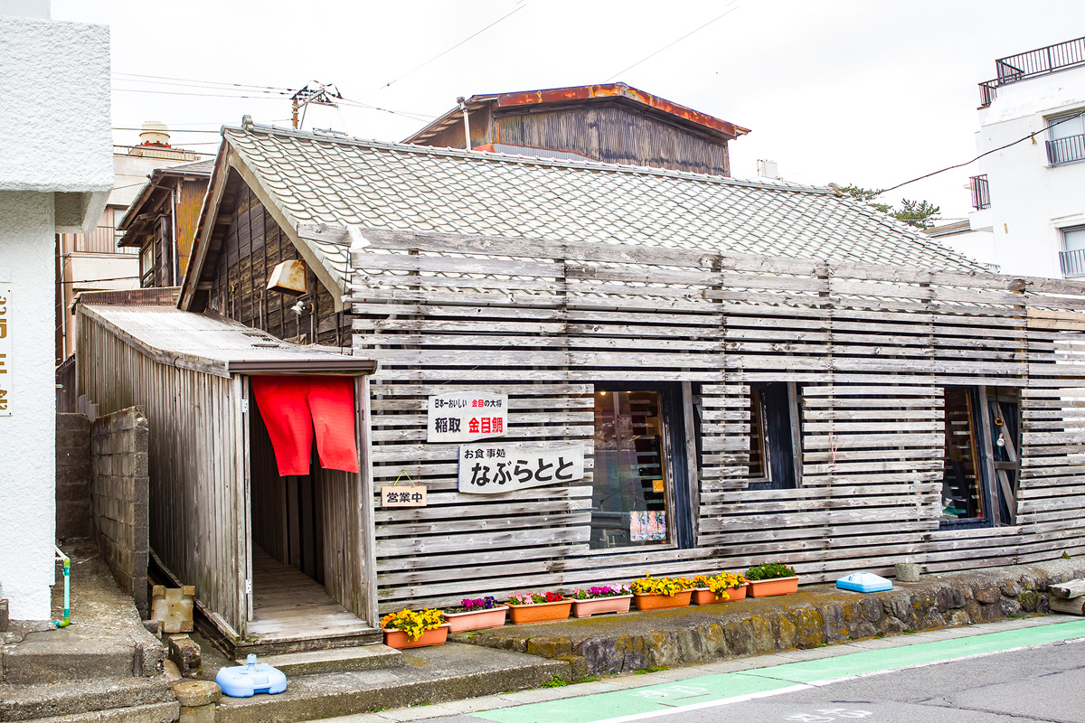 ランチにやってきたのは稲取漁港の目の前にある「きんめ処 なぶらとと」。漁師小屋を思わせる木造の外観が目印です。