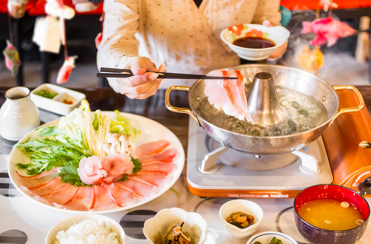 「きんめ鯛しゃぶしゃぶ定食」は、稲取キンメをさっとお湯にくぐらせて、地元の“花ゆずポン酢”につけていただきます。 軽く火を通せば甘みが増し、なかまで加熱すれば口の中でほろほろ崩れるくらい柔らかに。生でも食べられるのでお刺身として食べるのもアリ。写真は2人前の量ですが、1人前でも半身を贅沢に使い、大満足のボリュームです。