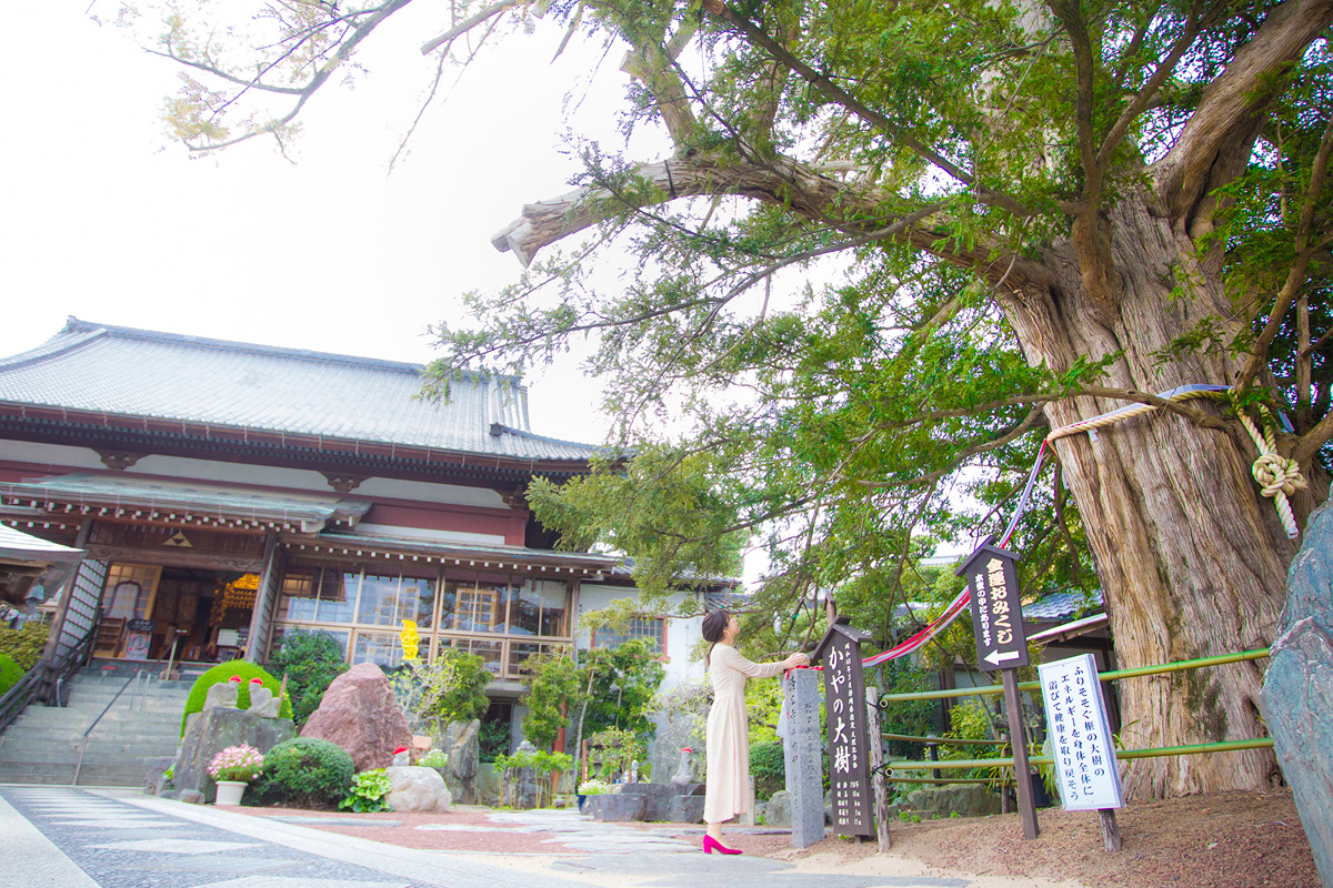 伊豆稲取駅近く、“かや寺”とも呼ばれる「済広寺」には静岡県指定天然記念物のかやの大樹がそびえています。なんと樹齢は約750年!樹高約18m、根回り約6mで、今も枝葉を力強く伸ばす姿に生命力を感じます。木と結ばれた金色の球体に手を当てて、パワーを授かって。