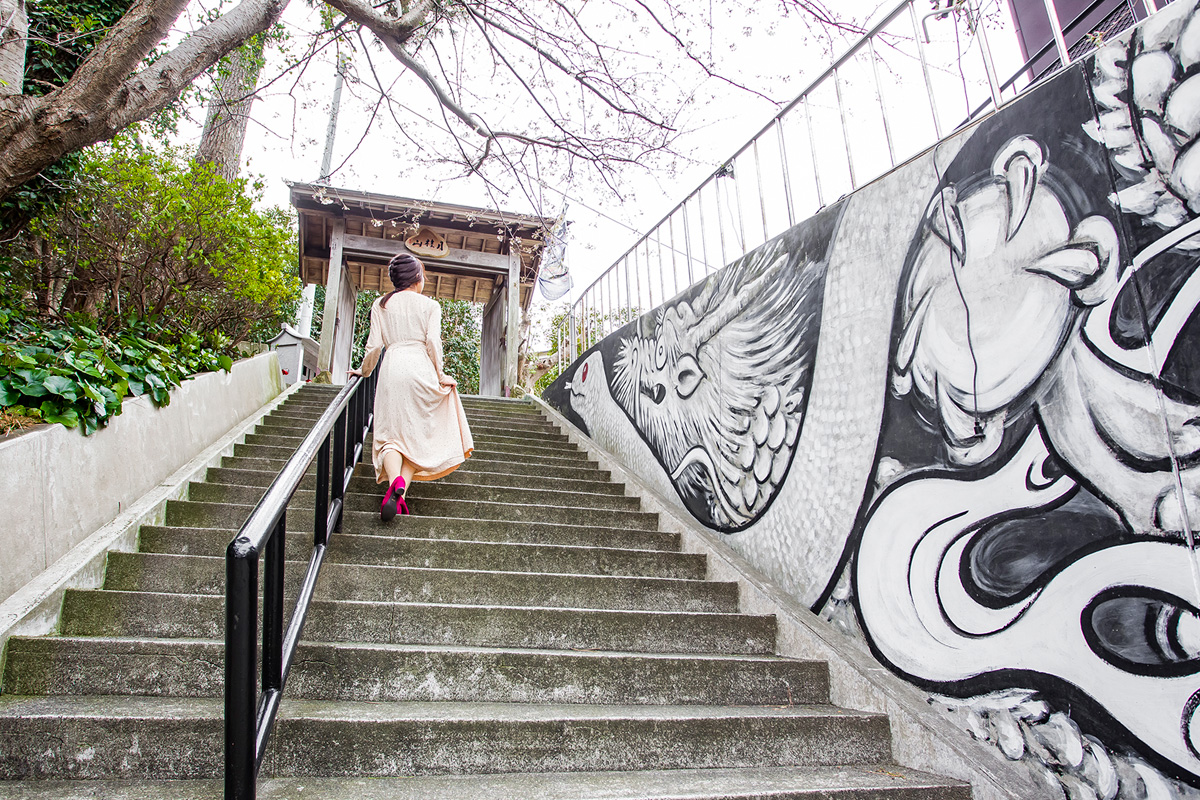 済広寺より歩いて5分。69段の階段の先にあるのは「清光院」。全長100m超えの壁には白蛇と白龍がダイナミックに描かれています。