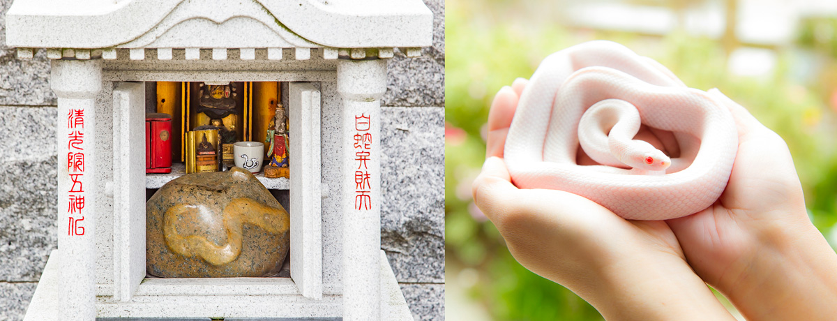 写真右はお寺で育てられている白蛇の大吉くん。
