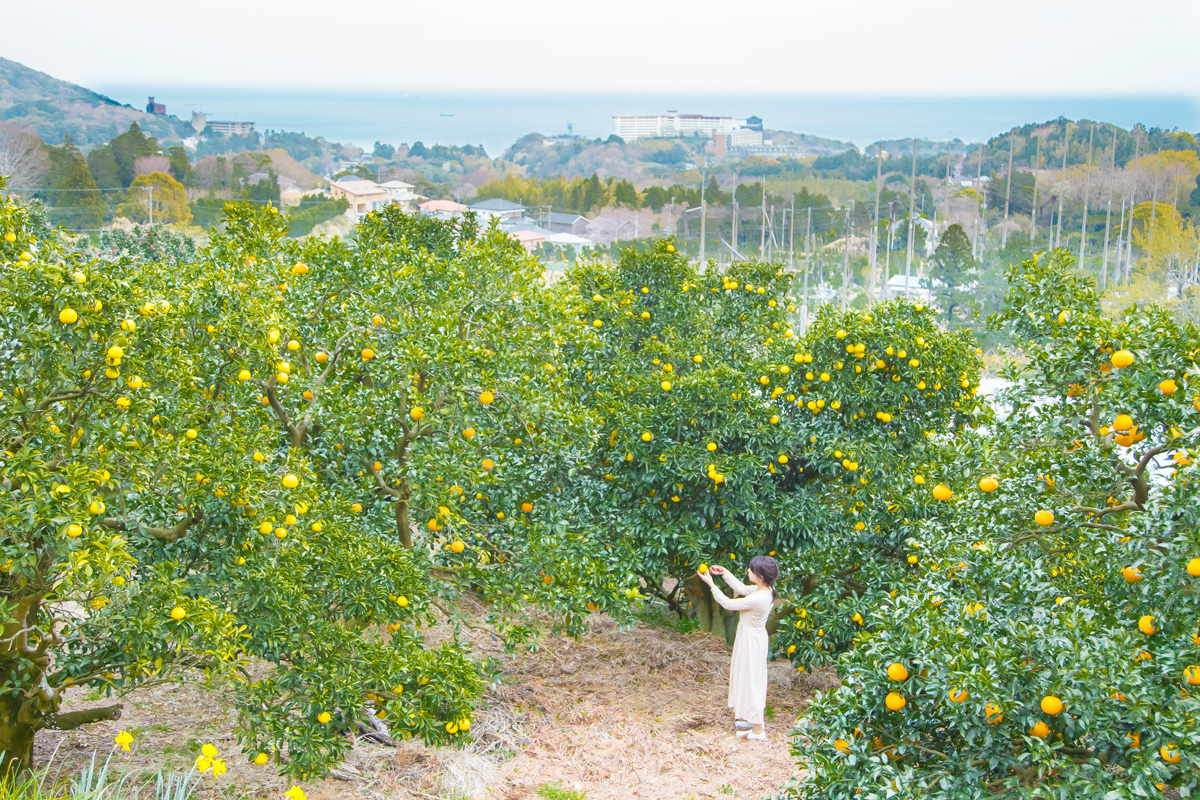 まず向かったのは熱川温泉の山側にある観光果樹園「樋ノ口園(ひのぐちえん)」。東南に向いた傾斜地にオレンジの木が立ち並び、濃いグリーンの木々に橙色や黄色の果実がたわわに実っています。眼下にはキラキラと輝く相模湾も見え、なんとも爽快!