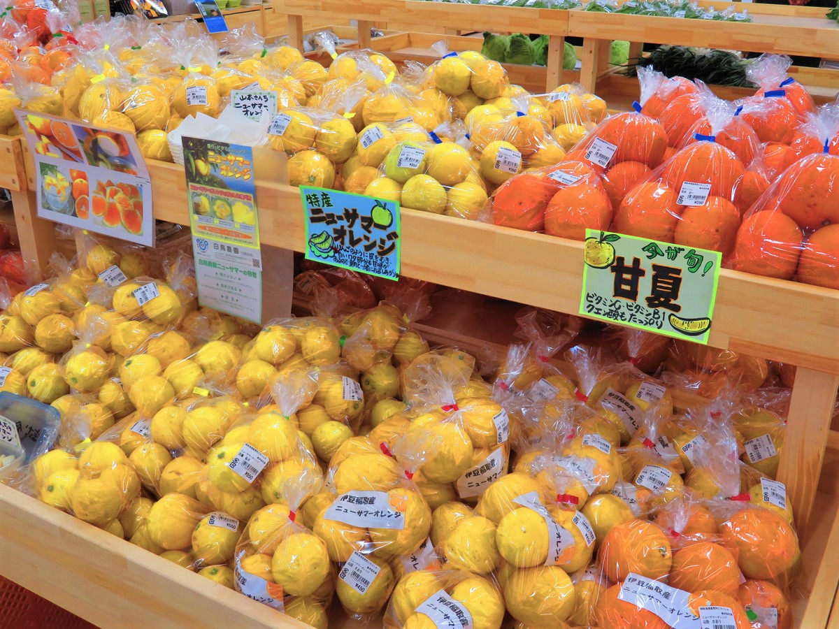 2019年4月19日(金)に稲取漁港前にオープンしたばかりの「稲取漁港直売所こらっしぇ」でお土産を買うことに。ここは漁協と農協がコラボした直売所で、海のものも山のものも揃っているんです。