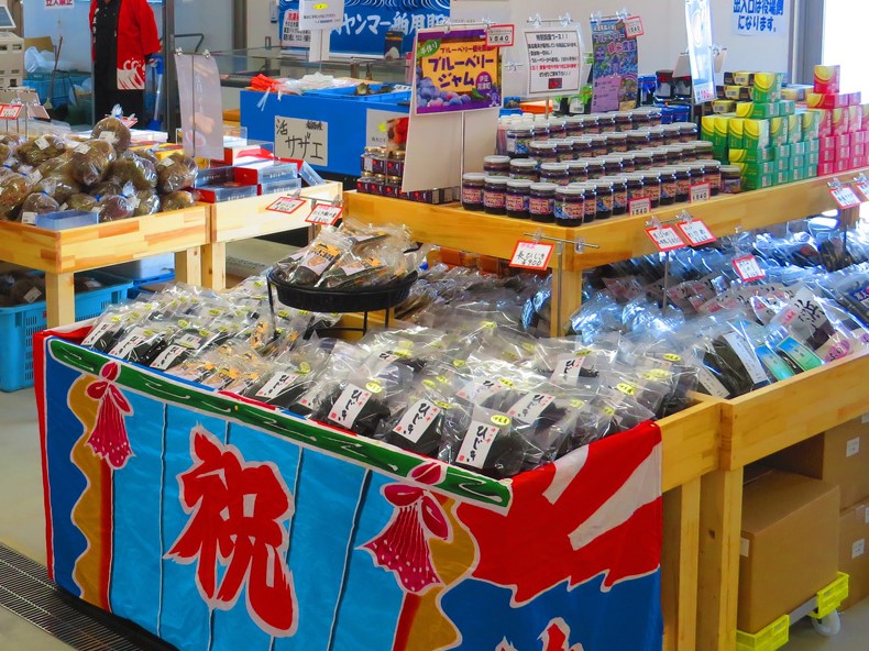 地元で水揚げされた水産物や採れたての農産物、東伊豆町地域認定商品など、新鮮でお手頃な商品がいっぱい。ニューサマーオレンジジャム(600円)や金目鯛せんべい(24枚入り 1080円)をお土産にゲットしました。