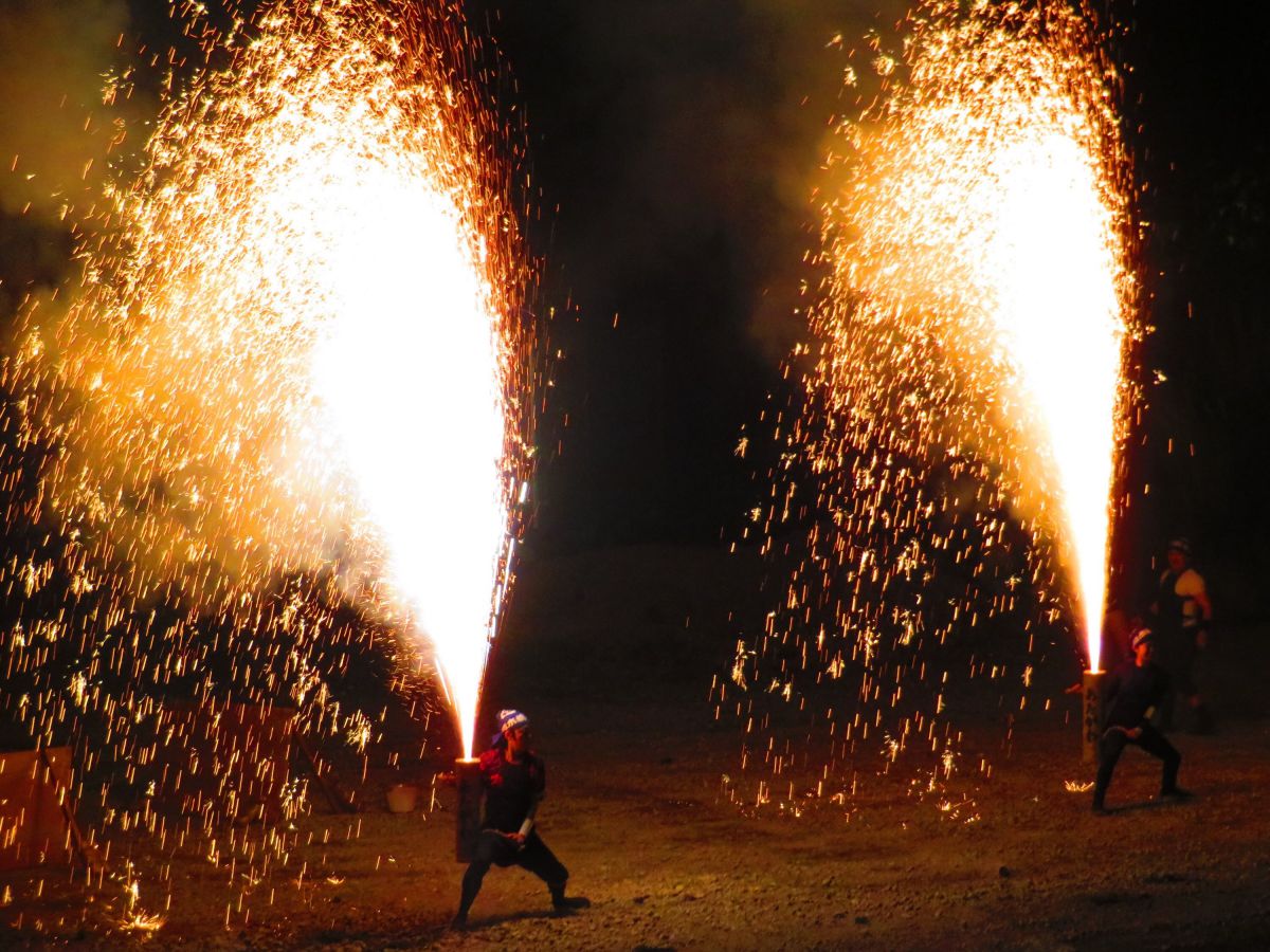 しおかぜ広場では写真の手筒花火も見られます。揚げ手が噴煙を上げる竹筒を持ち、大きな火柱が上がる様子は迫力満点!熱川海岸での開催日には海上花火が打ち上げられるので、そちらもお楽しみに。