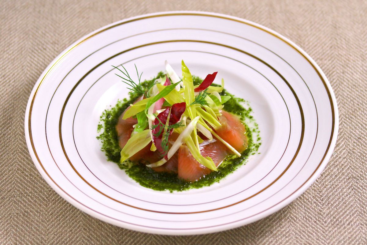 彩り豊かな「桜鱒のマリネ 春野菜のサラダ仕立て」1100円。