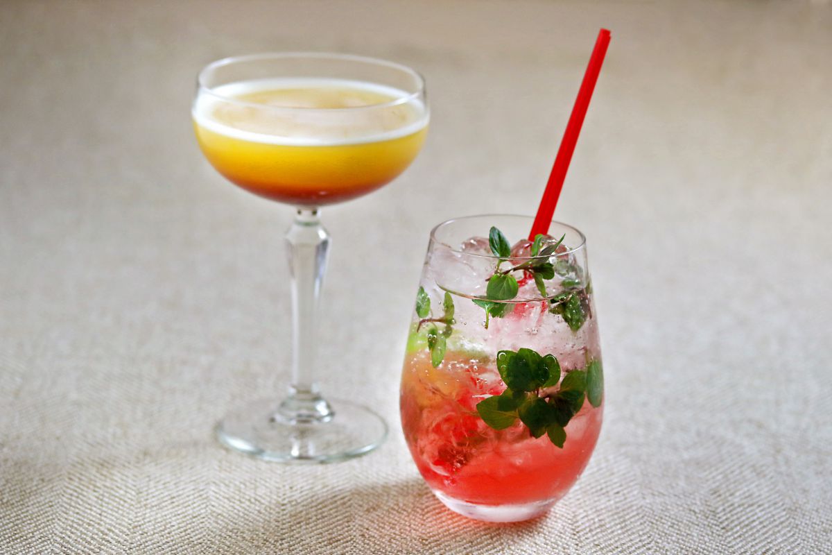 そんな雰囲気の中で、ディナータイム17~23時(22時LO)に、桜や春にちなんだ限定メニューが登場します。ドリンクは、お花見にぴったりの「オペラブロッサム700円(左)」と、「桜モヒート880円(左)」。