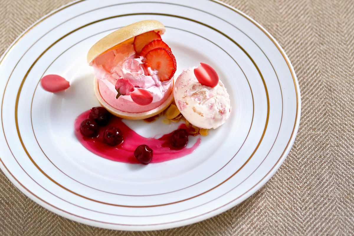 見た目もかわいい「フランボワーズのムースと桜の最中」900円。