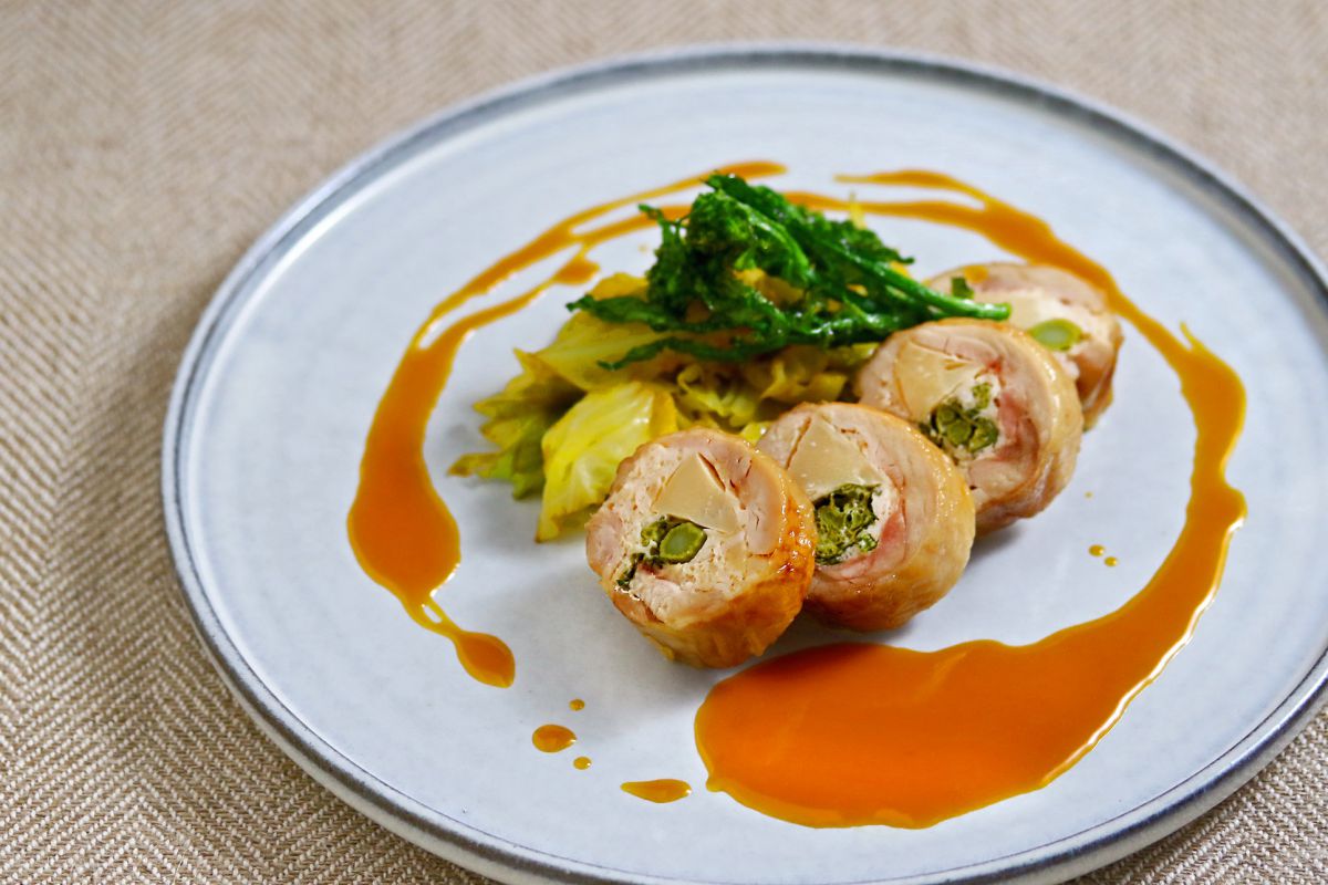 一皿に春がギュッと詰まった「鶏肉のバロティーヌ 春キャベツのブレゼ サフラン風味」1200円。