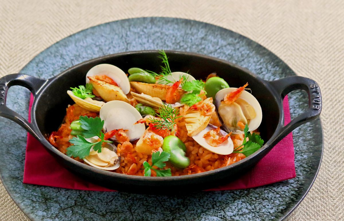 「桜海老と蛤の焼きリゾット」1600円からは、春がふんわり香ります。