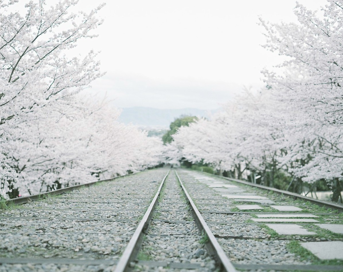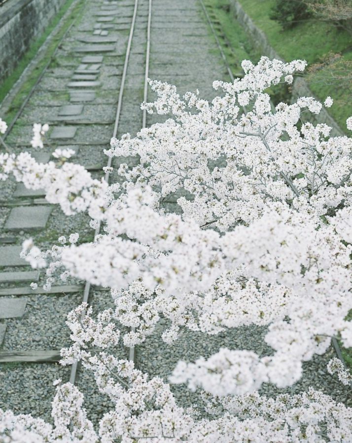 こちらは橋の上から見る桜越しの線路。情緒があって、とても素敵ですよね。上から見る桜もいいものです。