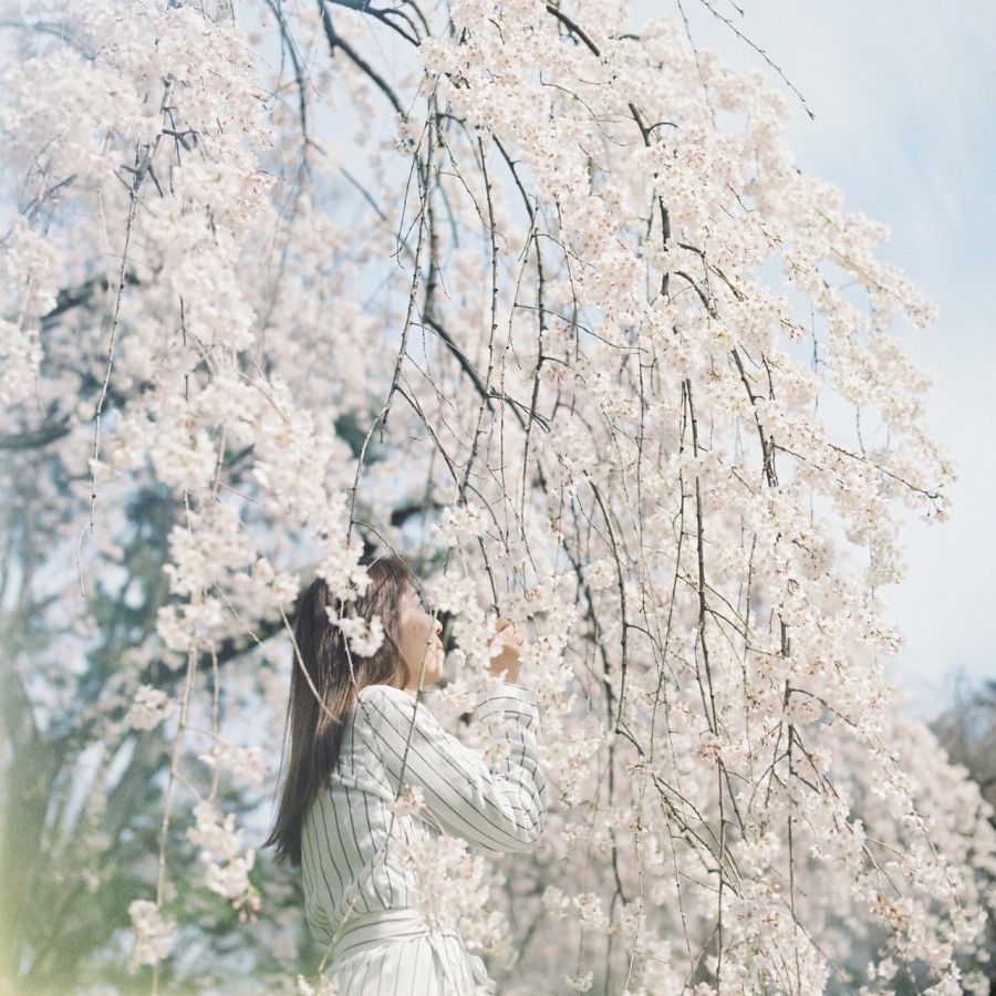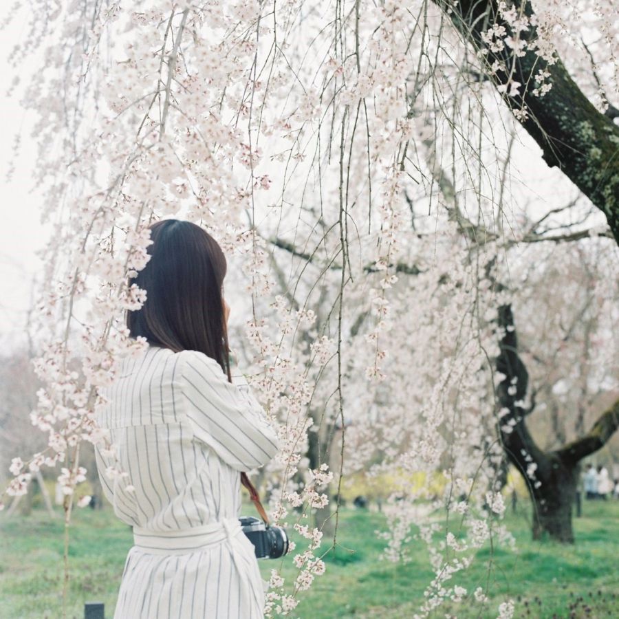 上から垂れ下がる「枝垂れ桜」は、やはり人とあわせて撮るのがおすすめです。