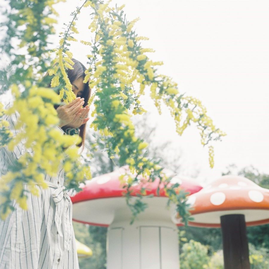 黄色い房状の形がかわいらしい「ミモザ」の花も、この時期に咲いています。バックに写っているキノコは、なんと図書館!キノコの中に本がたくさん詰まっているんですよ。