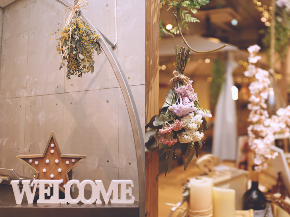 お店のコンセプトは“ウエディングパーティー”。内装はお店のスタッフさんですべてコーディネートしているというから驚きです。店内には大きなプロジェクターや音響も完備しているので、歓送迎会や女子会などのシーンでも利用できますね。