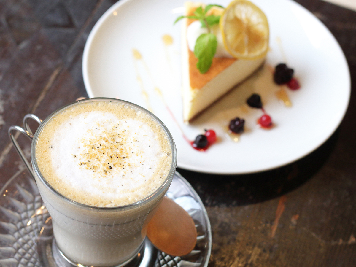 ベイクドケーキは、フォークを入れるとずっしりと重みを感じる重厚感。甘すぎない品の良い味わいとコーヒーの深い苦みがベストマッチ。また素敵なアンティークのお皿が優雅な気分を高めてくれて、より一層ぜいたくな味わいに感じられます。