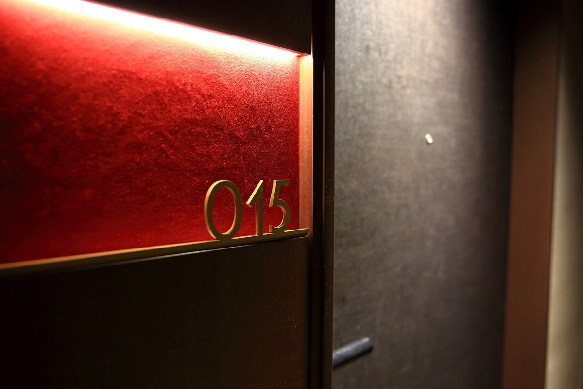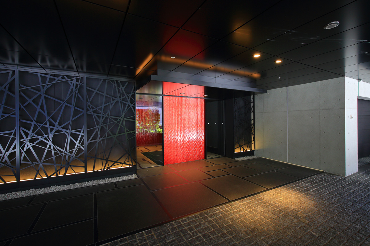 エントランスの扉には竹の節をイメージした模様が施され、塗りは和の伝統色・ベンガラ。深みのある色で、品のあるエレガントな雰囲気を演出しています。