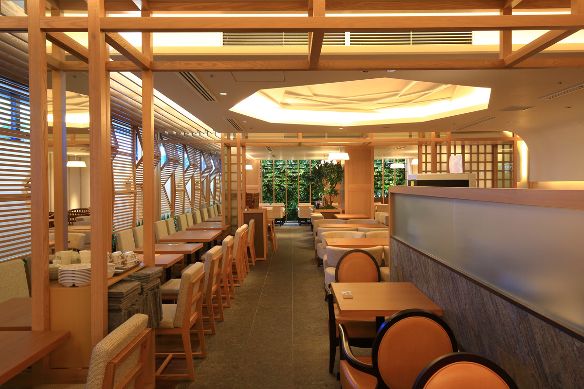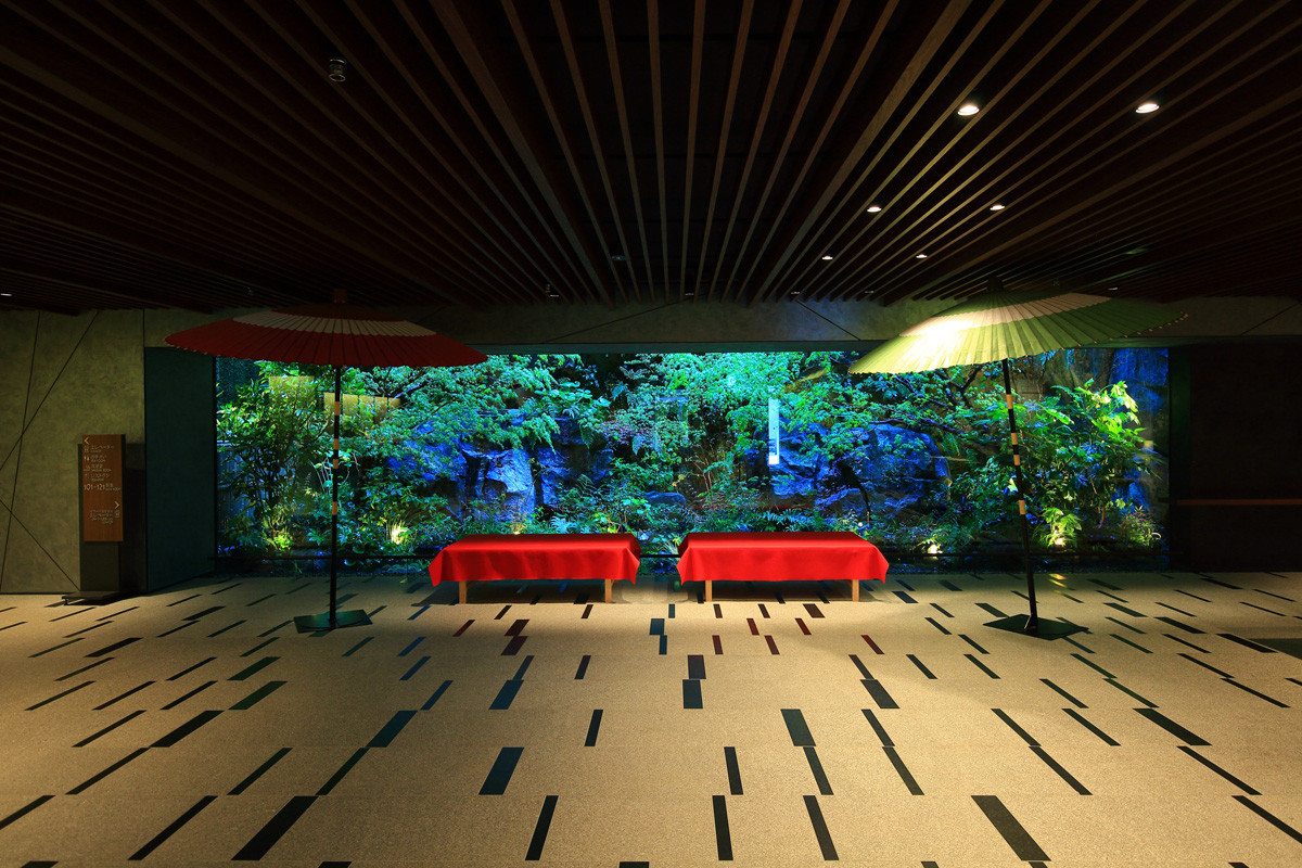 館内に足を踏み入れるとパノラマに広がる中庭がお出迎え。まるで巨大な絵画のようで思わず声を漏らしてしまうような景観です。この庭は世界的にも著名な庭園デザイナー石原和幸氏の手によるもの。和を取り入れた奥行のあるデザインで、バックは空まで吹き抜ける壁一面にも苔などの植物を配したモスウォール! 圧巻のスケールです。