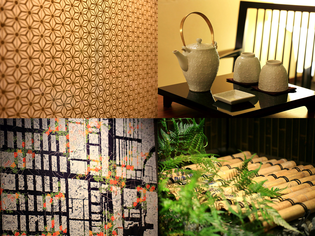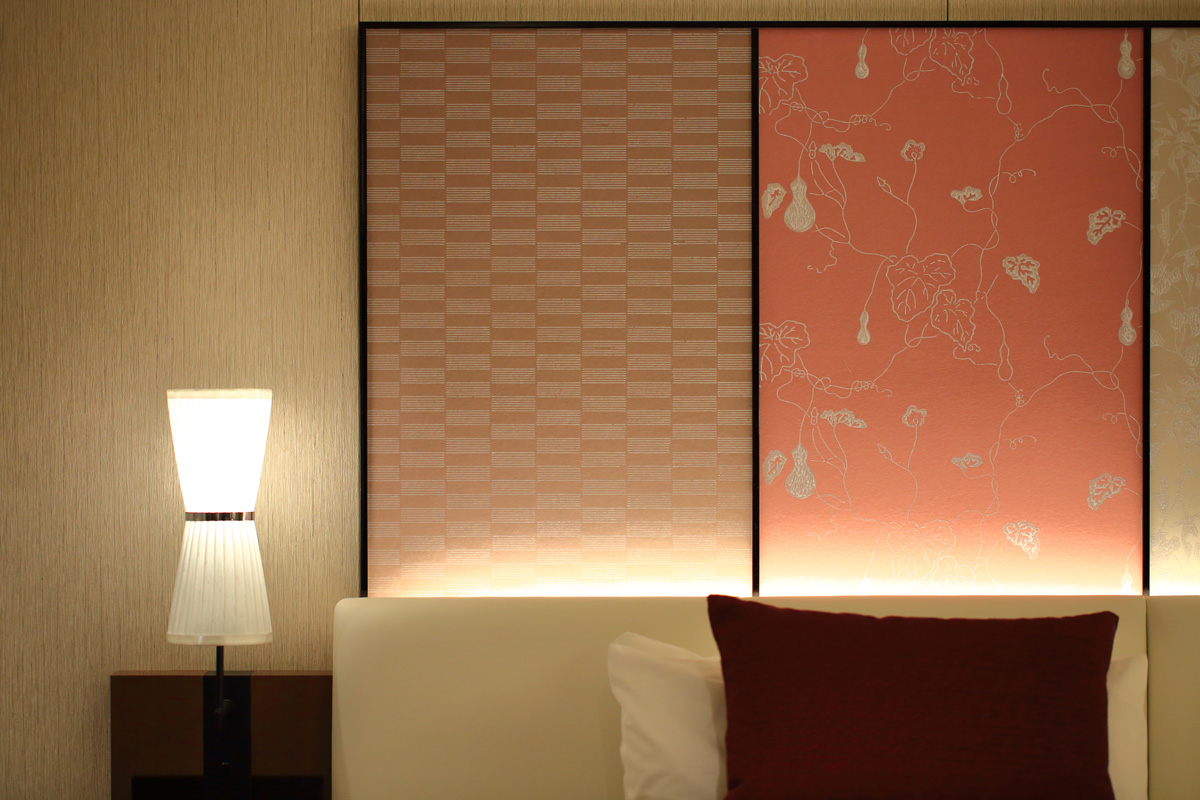 京都プレミアはベースとしてモダンな洋風テイストですが、“和”の要素もオシャレに散りばめられています。竹をモチーフにしたパーテーション、和柄のパネルや京唐紙の額、西陣織のモダンアートなど、古都を象徴するアイテムがロビーや部屋で発見でき、「京都に来ているんだなぁ」と改めて実感!