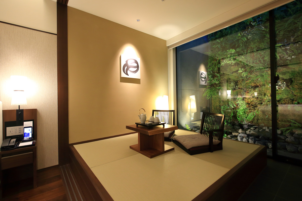 京都プレミアの大きな魅力は客室のバリエーション。鴨川を望む東向きの部屋、ちょっぴり特別な専用庭つきの部屋、スタンダードでも中庭のモスウォールが窓の外に広がる部屋などがあり、それぞれに趣が異なり、何度宿泊しても楽しめそうです。