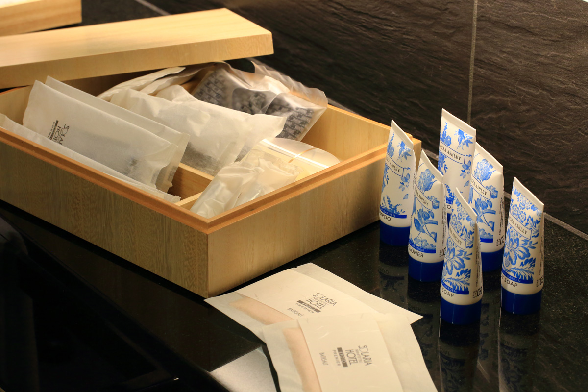 ハイクラス(エグゼクティブ、スイート利用)の場合、アメニティは木箱で用意され、バスタイムも京都らしく楽しめます。ローラアシュレイのボディーソープもうれしい!