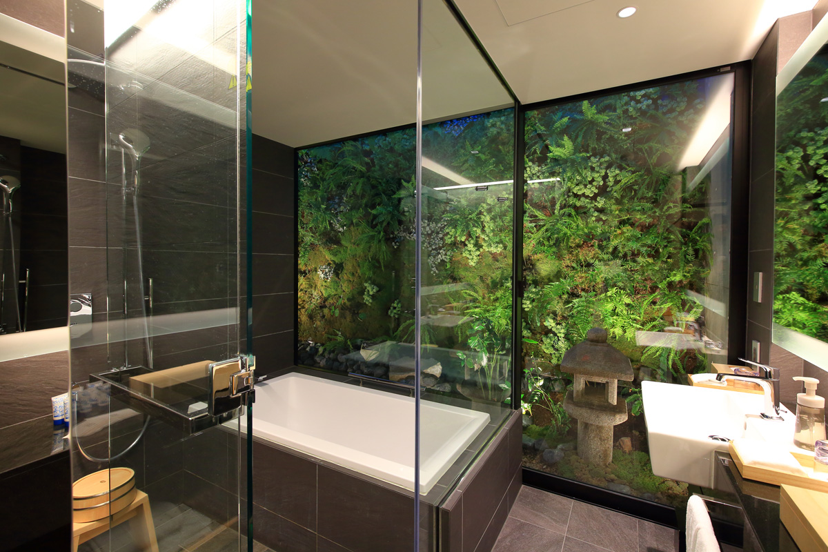 ガラスで囲まれたバススペース。モスウォールの庭がすぐ間近に迫り、湯に浸かっていると水槽の中にいるような気分でリラックスできそうです。