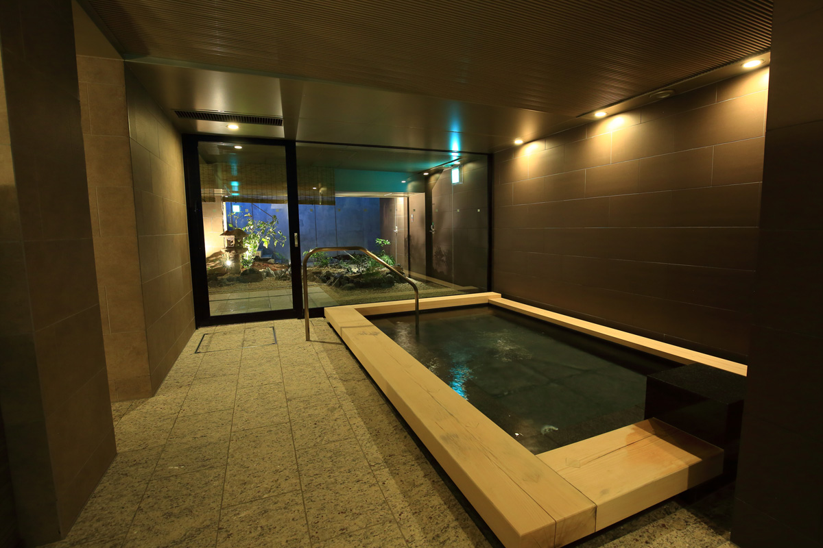 地下1階の大浴場も素敵なんです!ガラスの外に広がる庭は、腰掛がヒノキで造られた内湯からも眺められます。光の演出が、シックな浴場の雰囲気とあいまってとってもファンタジック!うっとりとくつろげるぜいたくな湯浴みが楽しめます。