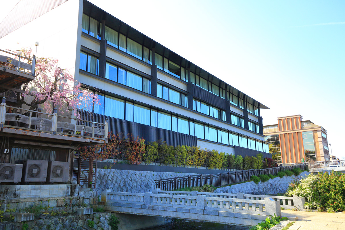 京都プレミアは御池大橋のたもとに位置するシックなホテル。すぐそばには鴨川の河川敷、エントランスのある木屋町通沿いには風情ある高瀬川が流れています。そんなザ・京都な雰囲気に溶け込むような落ち着いた佇まいが素敵です。