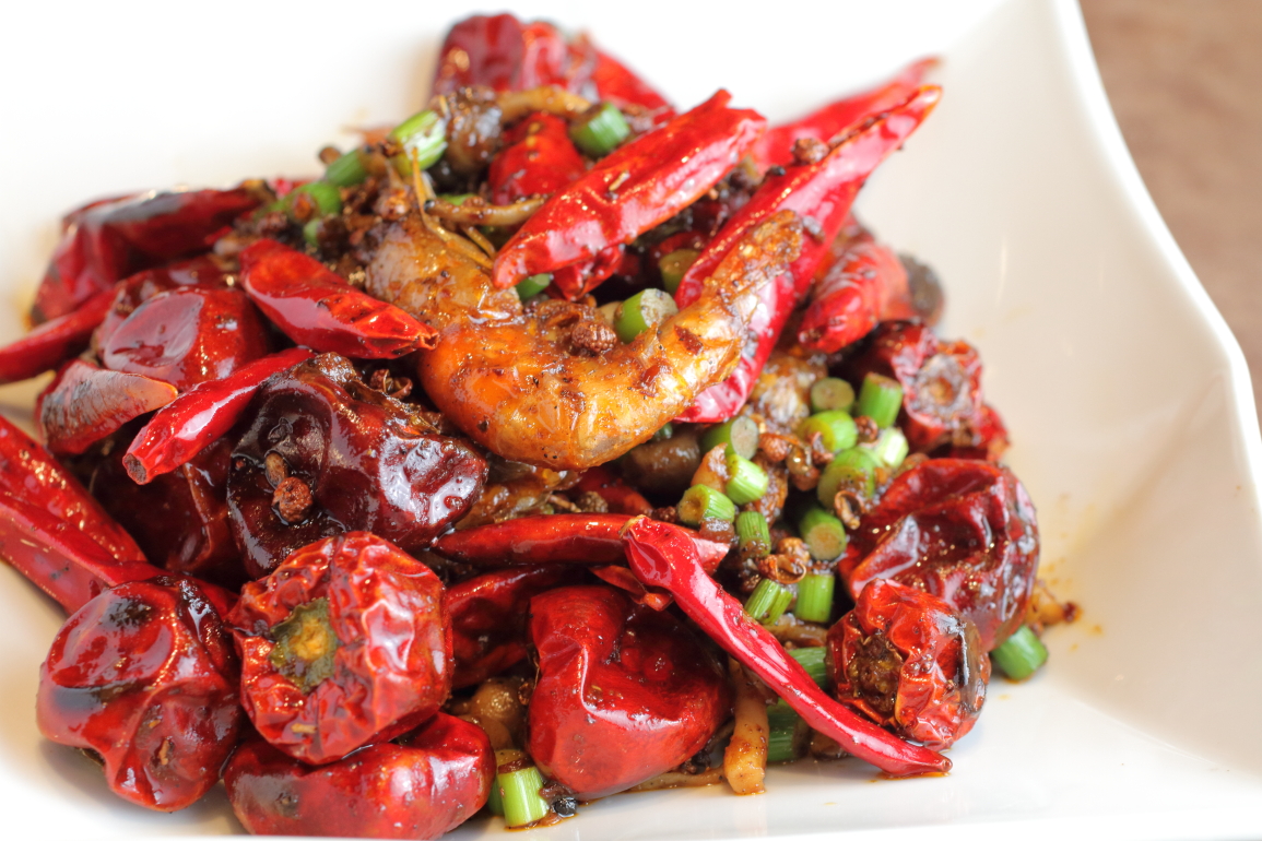 豆板醬ベースの辛いタレでエビと2種類の唐辛子を炒めています。口に運ぶと、最初は辛みが広がり、そのあとに山椒のしびれるような辛さがやってくる、まさに四川料理らしい一品です。