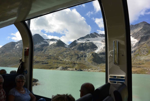 車窓はさすが世界遺産。流れ行く景色が、もうメインディッシュ。どこを切り取っても、絵画のような美しさです。見どころを逃さないよう、ポイントごとにドイツ語と英語の車内アナウンスが流れ、沿線の観光案内をサポートしてくれます。とりわけ、路線のハイライトのひとつラ ーゴ・ビアンコ(イタリア語で“白い湖”)の湖畔をたどる景色は美しすぎてため息が出るほど。最も標高の高いオスピツィオ・ベルニナ駅(2253m)で湖の対岸に見えるピッツ・カンブレナの峰々と氷河には圧倒されます。思わず乗客全員で撮影大会がスタート!車内が一体となる瞬間です。