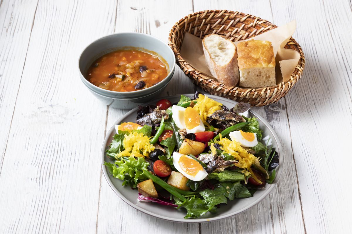 彩り豊かなたっぷりサラダと2種類以上のスープから好きなものをチョイスできる「ニース風サラダと選べるスープランチ」1200円。