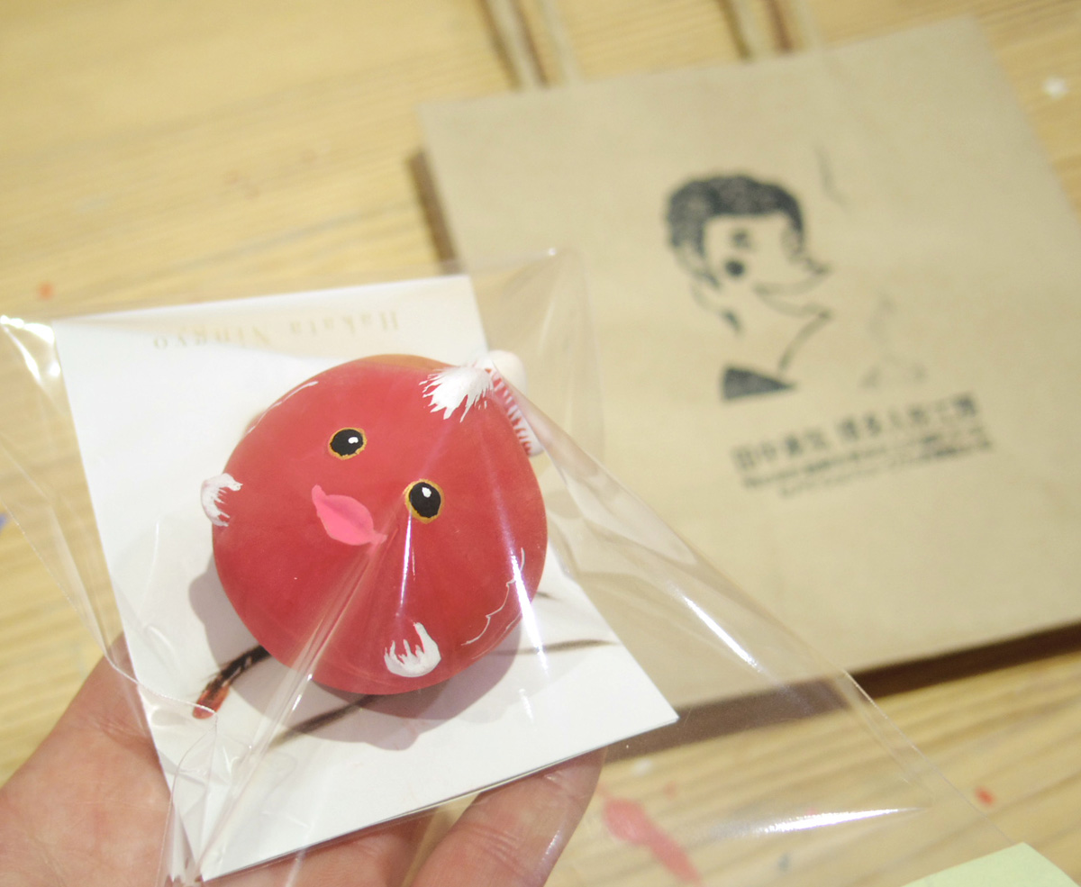 できた!タラコ唇が印象的な金魚の完成です。乾いたら、お持ち帰り用にかわいくラッピングしてもらえます。唯一無二のオリジナル博多人形、どこに飾ろう?