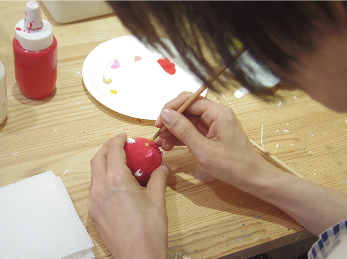 博多人形は本来、粘土をベースにした顔料で彩色するものですが、顔料は温めて使う必要があったり、原料のニカワが悪くなりやすかったりと扱いが難しく、初心者向きではありません。ですので、体験では扱いやすく発色も良いアクリル絵の具を使います。
