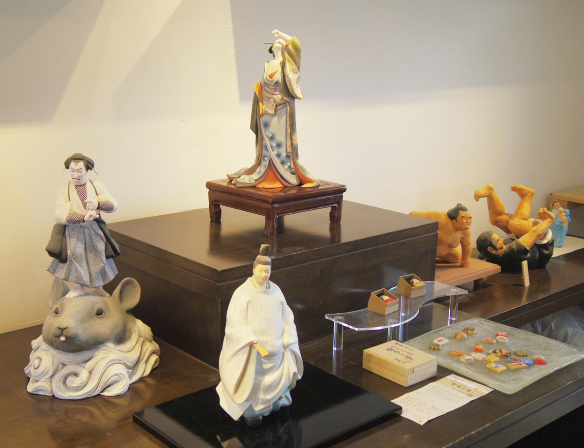 体験工房の一角には、田中さんの作品も並んでいます。しなやかな女性像や、躍動感を表現するためあえて荒々しく仕上げた力士の像など、それぞれの作品が持つ造形美と繊細な色遣いに、目を奪われます。